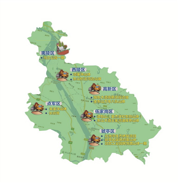 其中,夷陵区马兰公园一期为山体公园,高新区城东大道高新区段位边坡治理,其他均为山体修复工程。