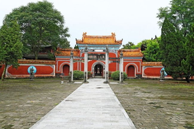 全国重点文物保护单位。位于当阳市玉泉街道办事处,距当阳城区约3公里,距宜昌城区70公里。属庙宇式建筑群,是三国时期蜀汉名将关羽无头之躯的埋葬地。 关陵在三国时便有土冢,南宋淳熙十五年(1188年),荆门守臣始于墓前建祭亭;元至元十四年(1277年),玉泉主持僧慧珍“剪其荆棘,封其土丘,重修墓道墓门,令僧看管。” 明成化三年(1467年),当阳县令重修武安王墓,并立庙供春秋祀之;清嘉靖十五年(1536年),建成较大规模的群体建筑,占地4.6万平方米。关陵的古建筑群依托陵墓修建的中轴对称式的帝陵格局,座西朝东,是明清以来典型的官式建筑,具有典型的南方秀丽风格,飞檐斗拱,攒尖歇山,红墙黄瓦,雕刻精美,内容丰富,手法精湛,结构处理独具匠心。中轴线上,顺次排列的是广场、新门楼、神道碑亭、石坊华表、三园门、马殿、拜殿、正殿、寝殿,寝殿为关羽坟,两厢另有附属建筑。