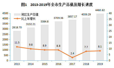 初步核算,全市实现生产总值4460.82亿元,比上年增长8.1%。分产业看,第一产业实现增加值416.05亿元,比上年增长3.3%;第二产业实现增加值2054.15亿元,比上年增长9.6%;第三产业实现增加值1990.62亿元,比上年增长7.5%。根据第四次经济普查结果,对2018年地区生产总值、三次产业及相关行业增加值等相关指标的历史数据进行了修订,修订后,2018年三次产业结构由9.5:52.5:38.0调整为9.6:45.9:44.5,据此核算2019年三次产业结构为9.3:46.1:44.6。按常住人口计算,人均地区生产总值107830元,比上年增长8.1%,较上年增加10162元。