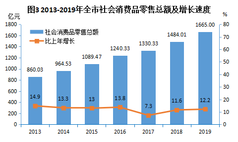 市场主体较快发展。截止2019年,全市市场主体存量单位为40.05万户,增长12.1%;新登记市场主体7.19万户,增长13.8%,其中新登记私营企业1.70万户,增长18.9%;新登记个体工商户5.27万户,增长11.9%。