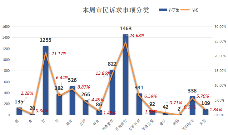 本周,市民反映较多的诉求是:疫情防控类1463件,占比24.68%;居住类1255件,占比21.17%;社会管理类822件,占比13.86%;就业类526件,占比8.87%;办事咨询类391件,占比6.59%。