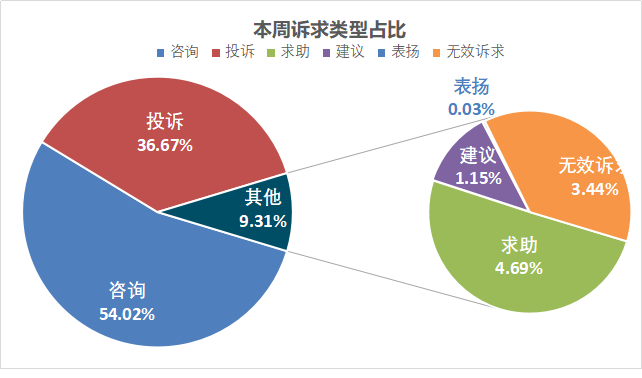 所有诉求中,咨询3203件,占比54.02%;投诉2174件,占比36.67%;求助278件,占比4.69%;建议68件,占比1.15%;表扬2件,占比0.03%;无效诉求204件,占比3.44%。