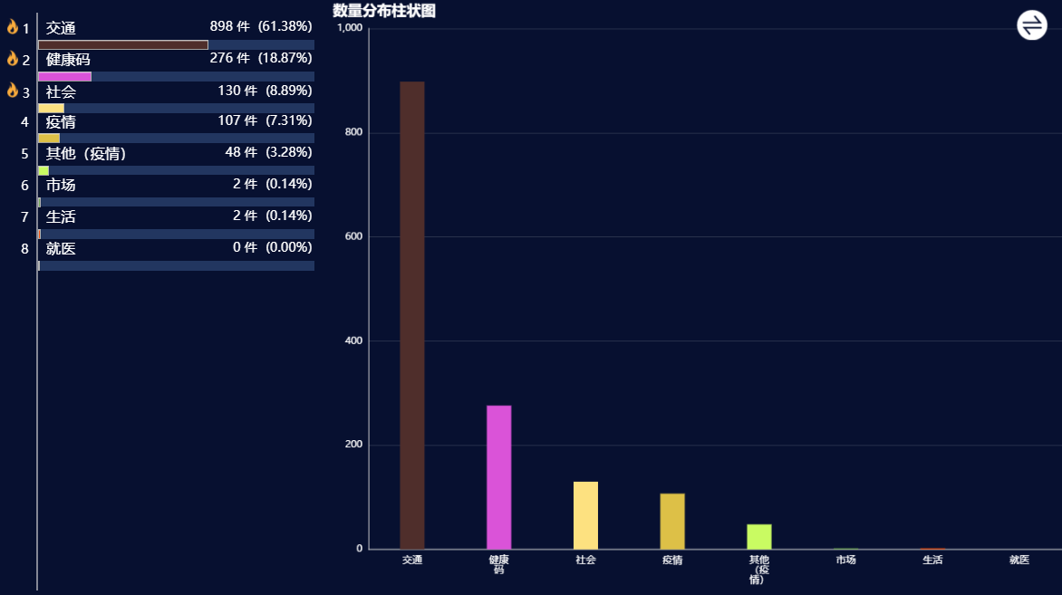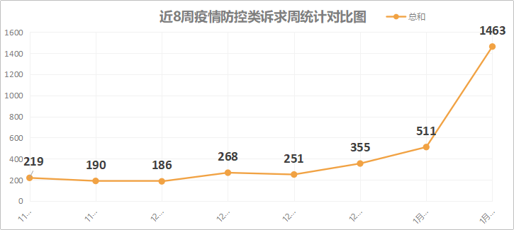 本周,疫情防控类诉求共受理1463件,较上周有所上升。主要是交通问题,占比61.38%;其次是健康码赋码疑议、健康码基本信息修改问题。