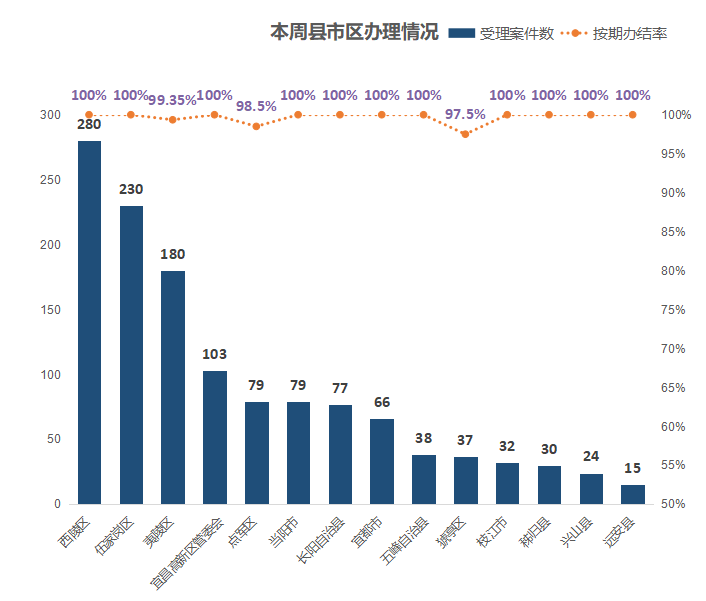 本周,县市区受理办件量前五的是:西陵区280件,伍家岗区230件,夷陵区180件,宜昌高新区管委会103件,点军区79件,当阳市79件。