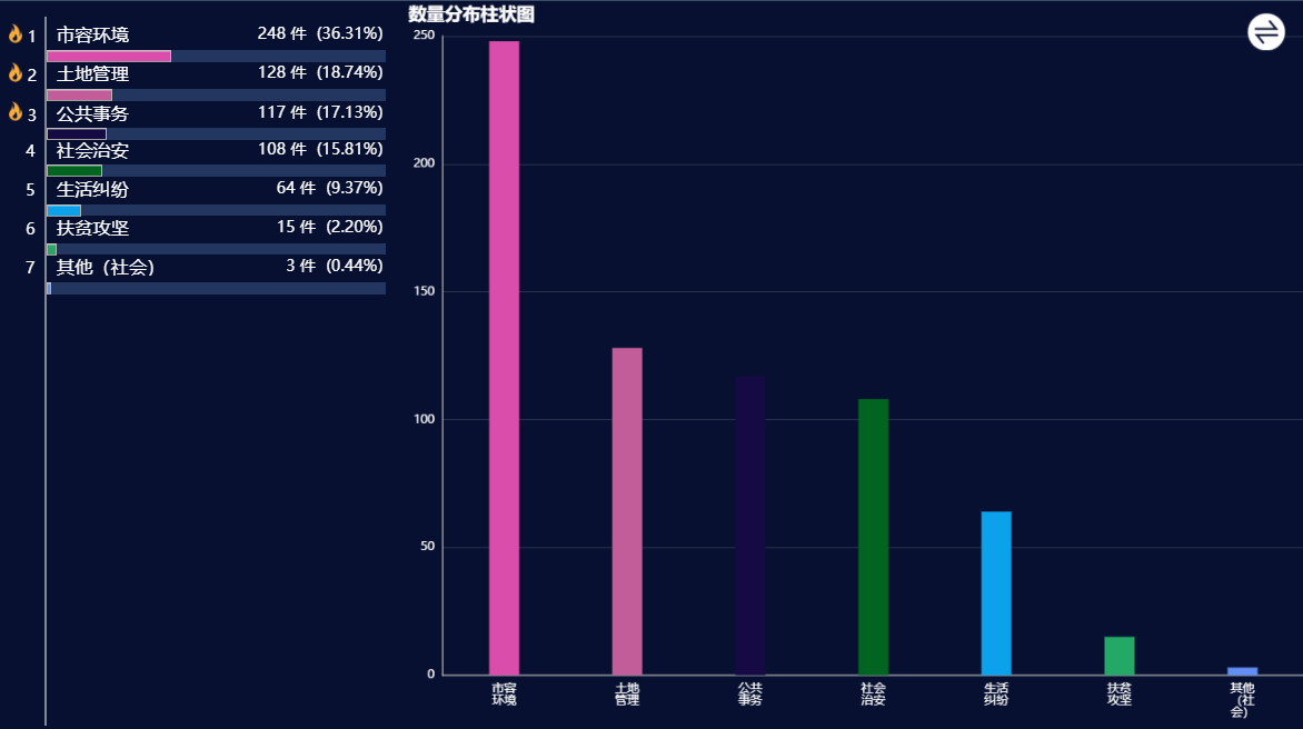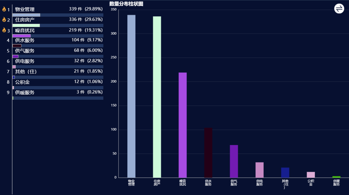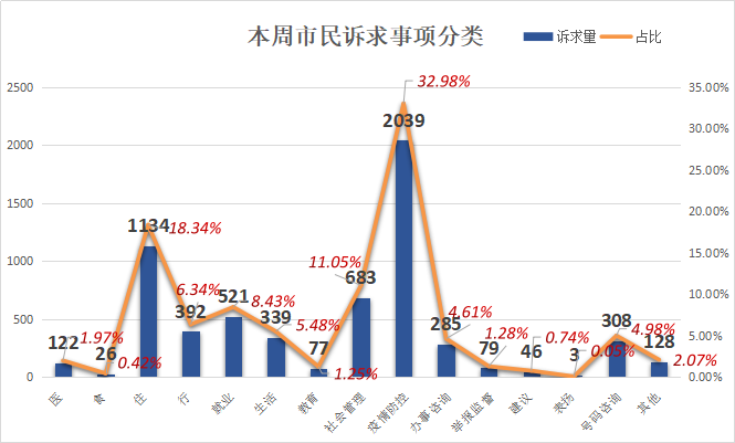 本周,市民反映较多的诉求是:疫情防控类2039件,占比32.98%;居住类1134件,占比18.34%;社会管理类683件,占比11.05%;就业类521件,占比8.43%;出行类392件,占比6.34%。