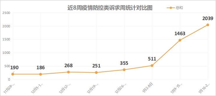 本周,疫情防控类诉求共受理2039件,较上周有所上升。主要是交通问题,占比69.2%;其次是健康码赋码疑议、健康码基本信息修改问题。