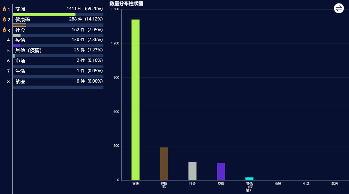 疫情防控类诉求中,反映较为集中的是交通问题和健康码问题。交通问题反映最多的是来宜交通咨询;健康码问题反映最多的是健康码赋码疑议。