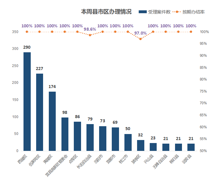 本周,县市区受理办件量前五的是:西陵区290件,伍家岗区227件,夷陵区174件,宜昌高新区管委会98件,点军区86件。