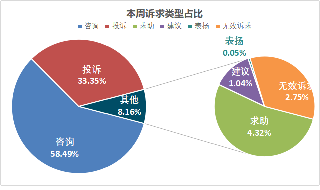 所有诉求中,咨询3616件,占比58.49%;投诉2062件,占比33.35%;求助267件,占比4.32%;建议64件,占比1.04%;表扬3件,占比0.05%;无效诉求170件,占比2.75%。