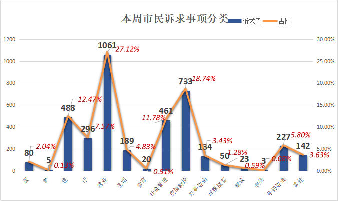 本周,市民反映较多的诉求是:就业类1061件,占比27.12%;疫情防控类733件,占比18.74%;居住类488件,占比12.47%;社会管理类461件,占比11.78%;出行类296件,占比7.57%。