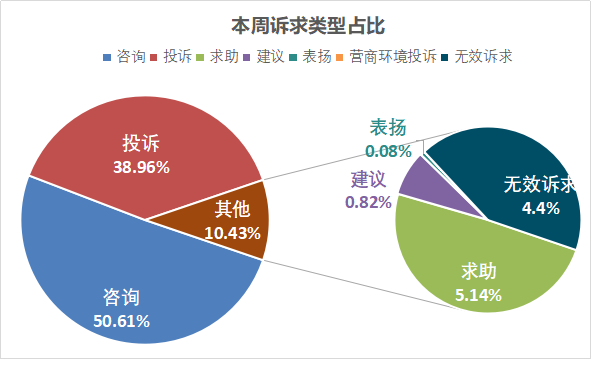 所有诉求中,咨询1980件,占比50.61%;投诉1524件,占比38.96%;求助201件,占比5.14%;建议32件,占比0.82%;表扬3件,占比0.08%;无效诉求172件,占比4.4%。