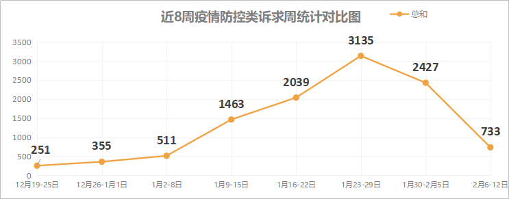 2021年2月6日0点至2021年2月12日24点,宜昌市12345市民服务热线共收到群众诉求3912件。其中,省12345来件20件,市民通过宜昌市人民政府网、宜昌发布微博微信、人民网等网络媒体反映诉求81件。较上周有所下降。