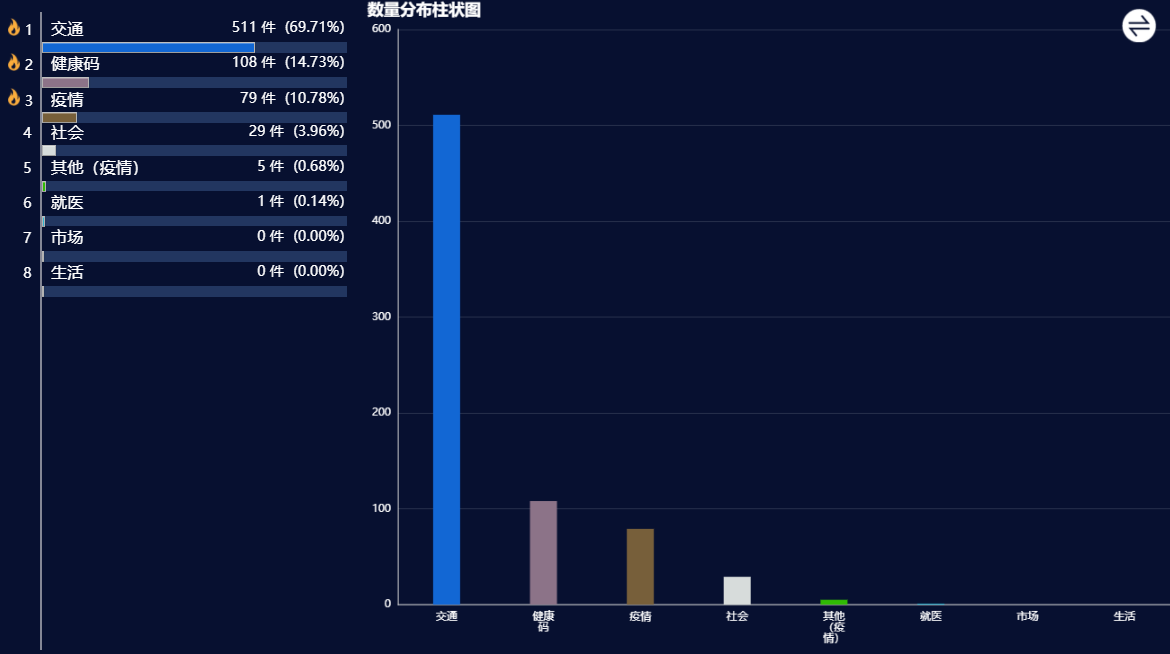 本周,疫情防控类诉求共受理733件,较上周有所下降。主要是交通问题,占比69.71%;其次是疫情咨询、健康码基本信息填写修改问题。