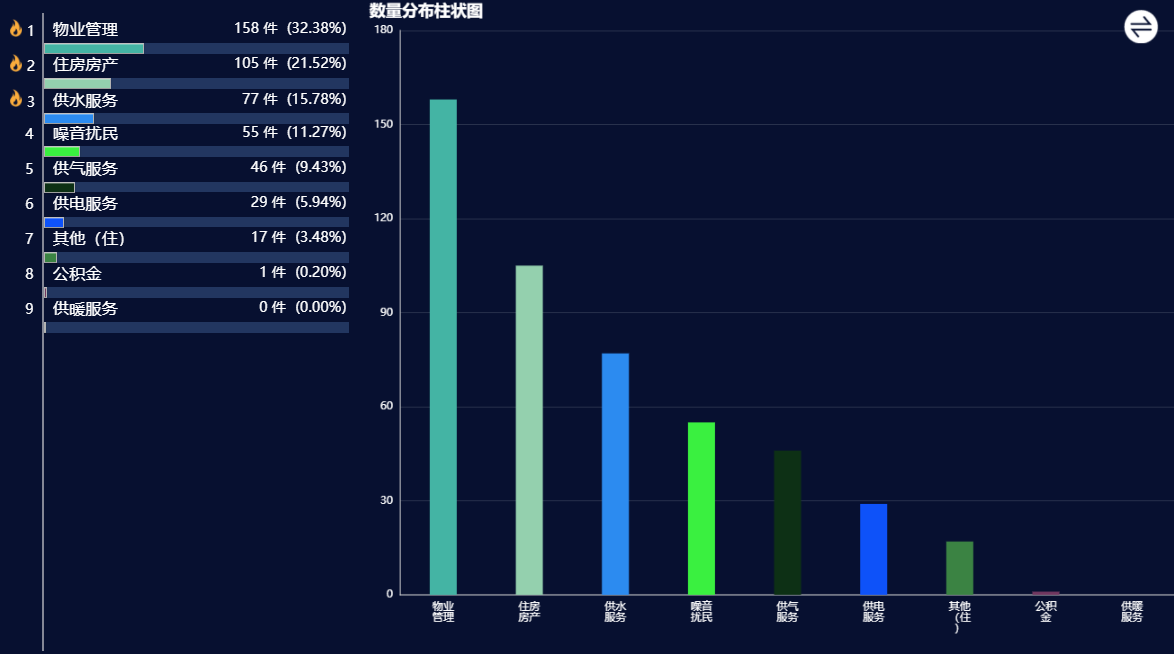 居住类诉求中,反映较为集中的是物业管理、住房房产和供水服务问题。物业管理类反映最多的是下水道堵塞或破损问题,住房房产类反映最多的是老旧小区改造问题,供水服务类主要以农村供水咨询为主。