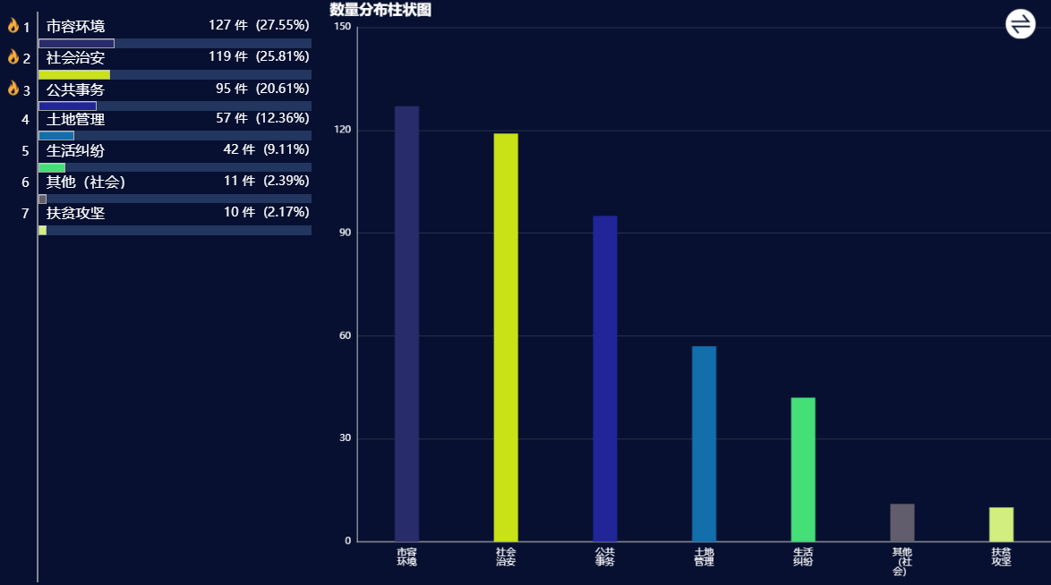 社会管理类诉求中,反映较为集中的是市容环境、社会治安问题。市容环境类反映较多的是占道经营问题;公共事务问题反映较多的是信访问题。
