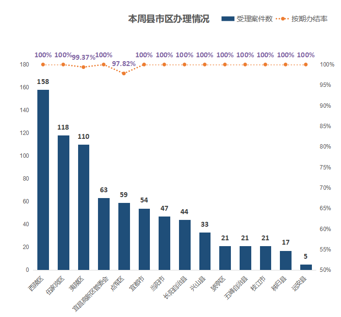 本周,县市区受理办件量前五的是:西陵区158件,伍家岗区118件,夷陵区110件,宜昌高新区管委会63件,点军区59件。