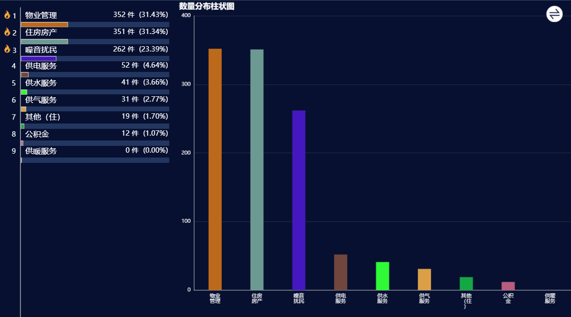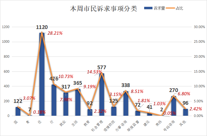 本周,市民反映较多的诉求是:居住类1120件,占比28.21%;社会管理类577件,占比14.53%;出行类426件,占比10.73%;生活类365件,占比9.19%;办事咨询类338件,占比8.51%。