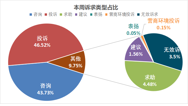 所有诉求中,咨询1736件,占比43.73%;投诉1847件,占比46.52%;求助178件,占比4.48%;建议62件,占比1.56%;表扬2件,占比0.05%;营商环境投诉6件,占比0.15%;无效诉求139件,占比3.5%。