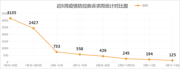 2021年3月13日0点至2021年3月19日24点,宜昌市12345市民服务热线共收到群众诉求3970件。其中,省12345来件22件,市民通过宜昌市人民政府网、宜昌发布微博微信、人民网等网络媒体反映诉求182件。较上周有所上升。