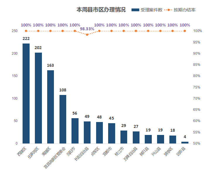 本周,县市区受理办件量前五的是:西陵区222件,伍家岗区202件,夷陵区163件,宜昌高新区管委会108件,当阳市56件。