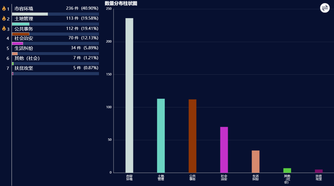 社会管理类诉求中,反映较为集中的是市容环境、土地管理问题。市容环境类反映较多的是占道经营问题;土地管理问题反映较多的是土地产权纠纷问题。