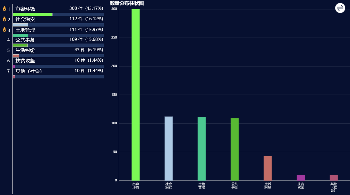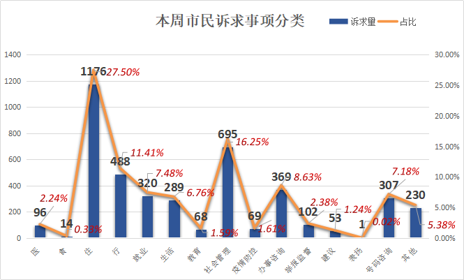 本周,市民反映较多的诉求是:居住类1176件,占比27.50%;社会管理类695件,占比16.25%;出行类488件,占比11.41%;办事咨询类369件,占比8.63%;就业类320件,占比7.48%。