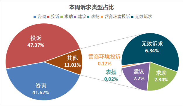 所有诉求中,咨询1780件,占比41.62;投诉2026件,占比47.37%;求助100件,占比2.34%;建议94件,占比2.2%;表扬1件,占比0.02%;营商环境投诉5件,占比0.12%;无效诉求271件,占比6.34%。