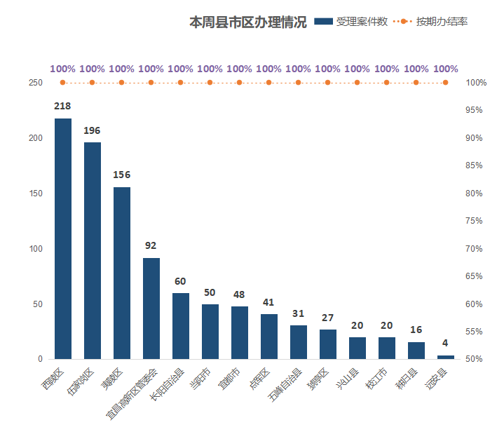 本周,县市区受理办件量前五的是:西陵区218件,伍家岗区196件,夷陵区156件,宜昌高新区管委会92件,长阳自治县60件。