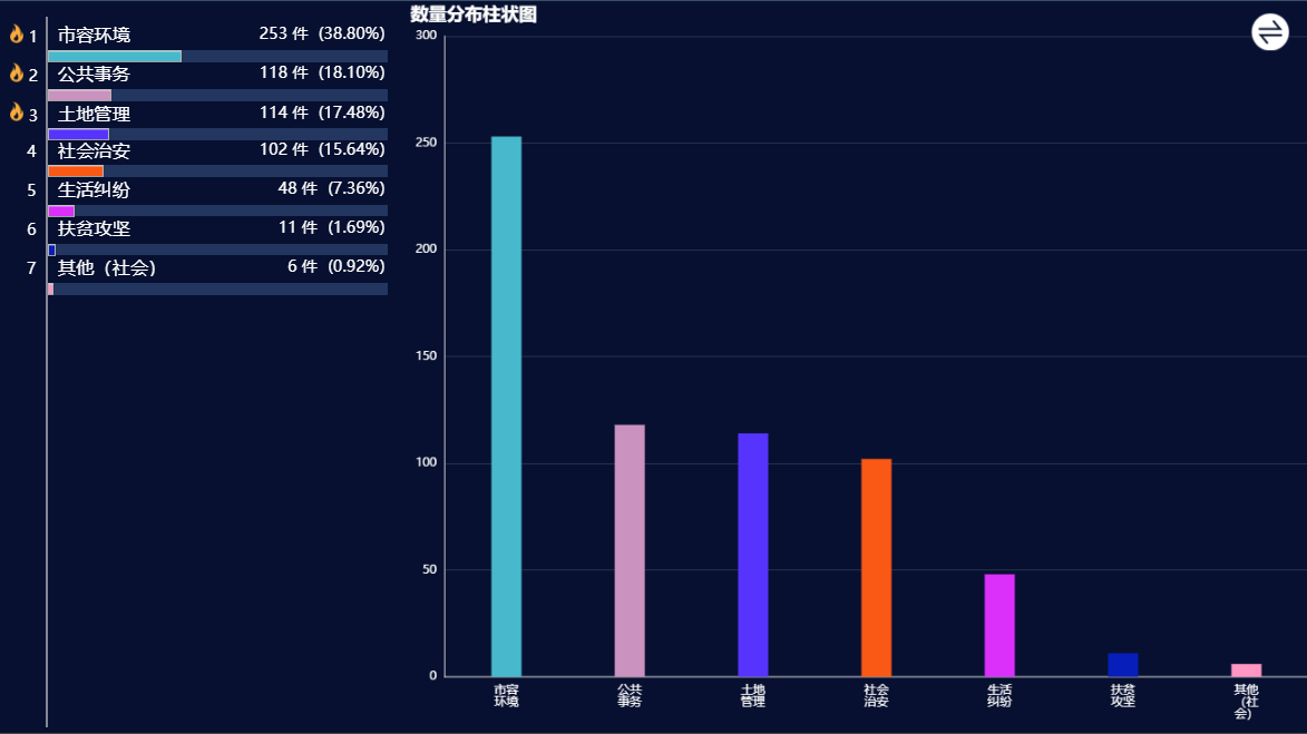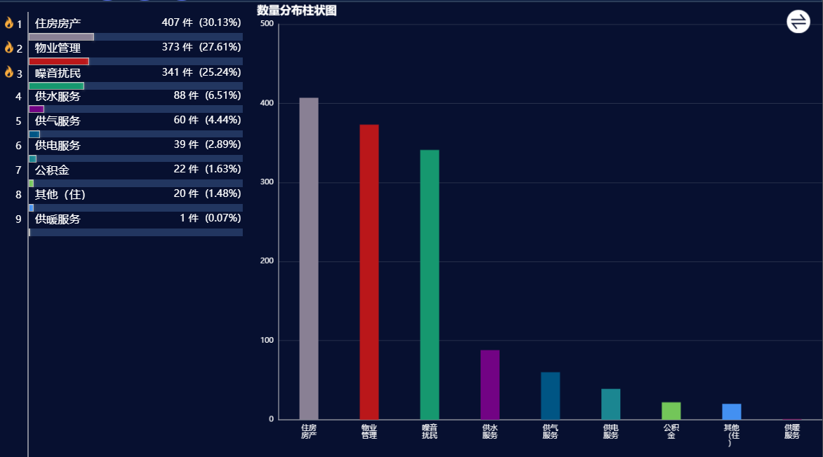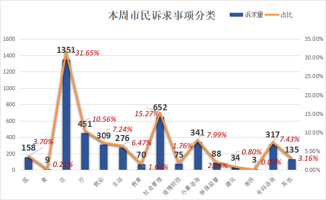 本周,市民反映较多的诉求是:居住类1351件,占比31.65%;社会管理类652件,占比15.27%;出行类451件,占比10.56%;办事咨询类341件,占比7.99%;号码咨询类317件,占比7.43%。