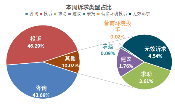 所有诉求中,咨询1865件,占比43.69%;投诉1976件,占比46.29%;求助154件,占比3.61%;建议75件,占比1.76%;表扬4件,占比0.09%;营商环境投诉1件,占比0.02%;无效诉求194件,占比4.54%。