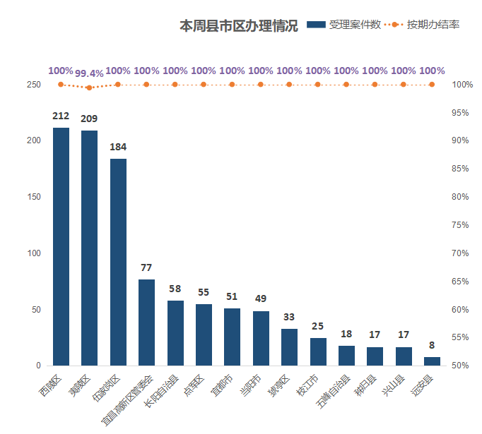 本周,县市区受理办件量前五的是:西陵区212件,伍家岗区209件,夷陵区184件,宜昌高新区管委会77件,长阳自治县58件。