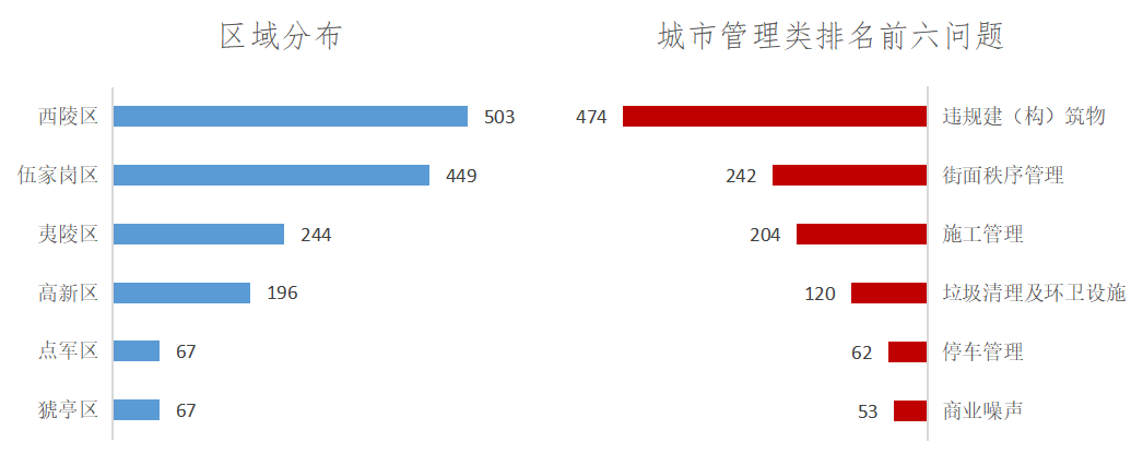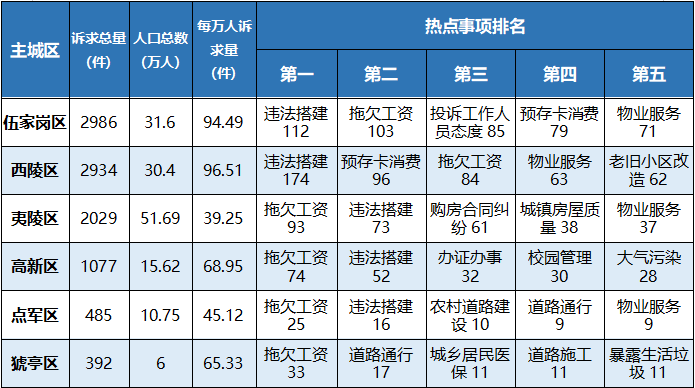 10月,城区(含夷陵区,下同)办理9903件,市直部门办理4074件,其他为县市办理。城区各区诉求量与人口总数(网格核查数)关系及诉求热点如下图。其中,西陵区和伍家岗区“万人诉求量”最高,达到96.51和94.49件,夷陵区较低,只有39.25件。