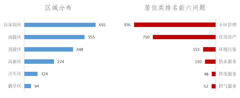 各区受理的诉求中,排名第一的事项类别为“居住类”诉求,共2120件。市民反映诉求较多的事项为:小区管理、住房房产、环境污染、水电气服务等方面。详见图。