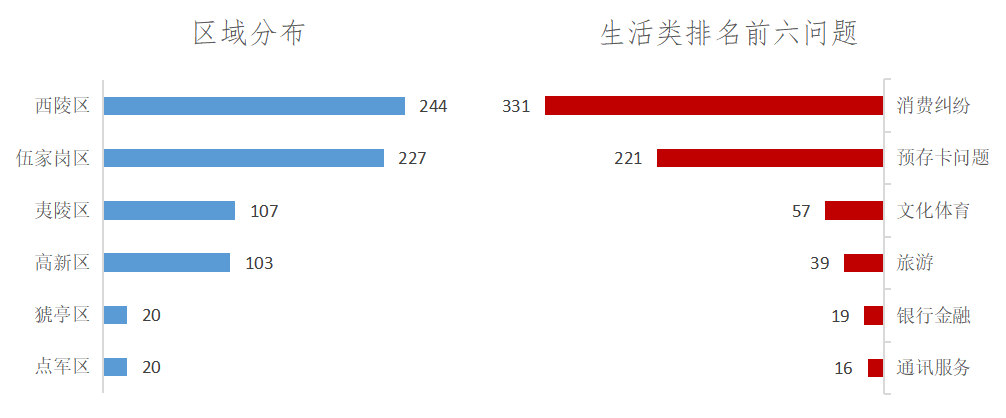排名第三的事项类别为“生活类”,共721件。市民反映诉求较多的事项为:消费纠纷、预存卡问题、文化体育、旅游、银行金融、通讯服务等方面。详见图。