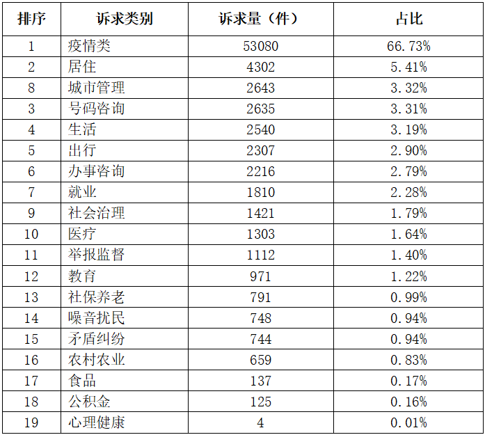 按诉求一级类别统计,主要反映的问题依次是:疫情防控、居住、城市管理、号码咨询、生活、出行、办事咨询、就业、社会治理、医疗,以上十类占总比93.35%。