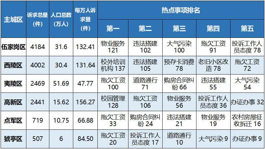 11月,城区(含夷陵区,下同)办理14319件,市直部门办理4640件,其他为县市办理。城区各区诉求量与人口总数(网格核查数)关系及诉求热点如下图。其中,伍家岗区和西陵区“万人诉求量”最高,达到132.41和131.64件,夷陵区较低,只有47.77件。