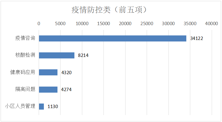 疫情防控类诉求中,市民反映诉求较多的前五类事项分别为:疫情咨询、核酸检测、健康码应用、隔离问题、小区人员管理,以上五类占疫情防控类总比98.08%。