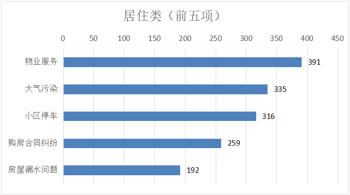 居住类诉求中,市民反映诉求较多的前五类事项分别为:物业服务、大气污染、小区停车、购房合同纠纷、房屋漏水,以上五类占居住类总比34.7%。