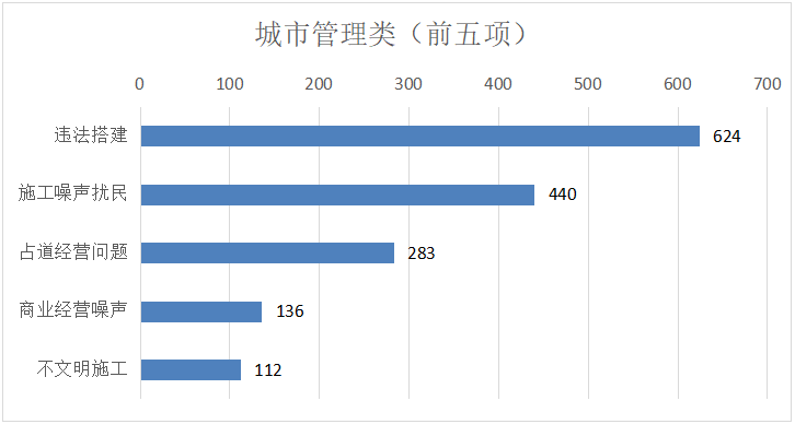 城市管理类诉求中,市民反映诉求较多的前五类事项分别为:违法搭建、施工噪声扰民、占道经营、商业经营噪声、不文明施工,以上五类占城市管理类总比60.35%。