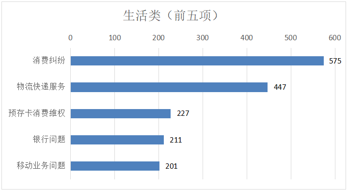 生活类诉求中,市民反映诉求较多的前五类事项分别为:消费纠纷、物流快递服务、预存卡消费维权、银行问题、移动业务问题,以上五类占生活类总比65.39%。