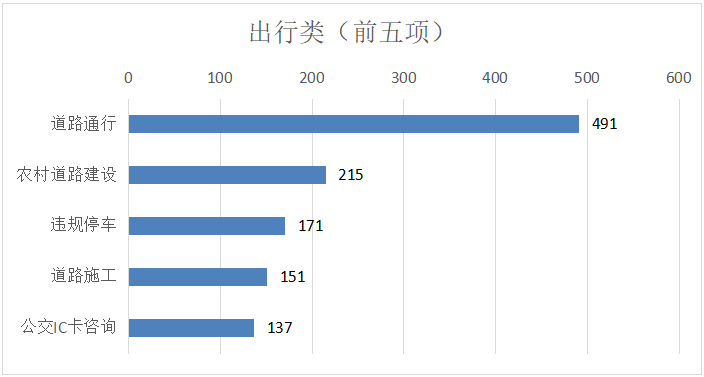 出行类诉求中,市民反映诉求较多的前五类事项分别为:道路通行、农村道路建设、违规停车、道路施工、公交IC卡咨询,以上五类占出行类总比50.50%。