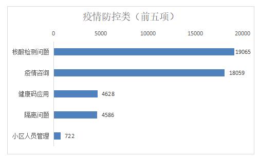 疫情防控类诉求中,市民反映诉求较多的前五类事项分别为:核酸检测、疫情咨询、隔离问题、健康码应用、小区人员管理,以上五类占疫情防控类总比92.69%。