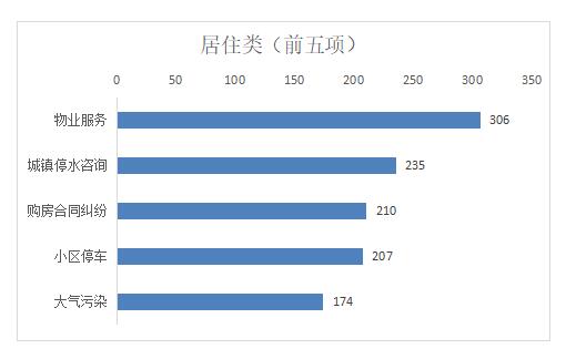 居住类诉求中,市民反映诉求较多的前五类事项分别为:物业服务、城镇停水咨询、购房合同纠纷、小区停车、大气污染,以上五类占居住类总比27.43%。