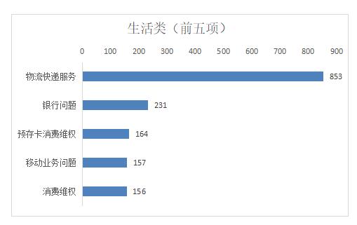 生活类诉求中,市民反映诉求较多的前五类事项分别为:物流快递服务、银行问题、预存卡消费维权、移动业务问题、消费纠纷,以上五类占生活类总比51.77%。