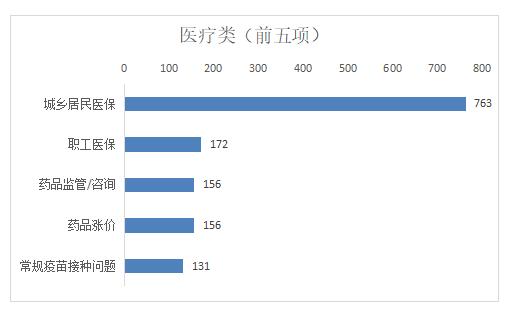 医疗类诉求中,市民反映诉求较多的前五类事项分别为:城乡居民医保、职工医保、药品监管/咨询、药品涨价、常规疫苗接种问题,以上五类占医疗类总比58.29%。