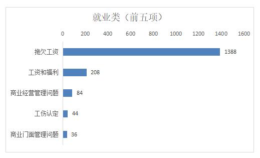 就业类诉求中,市民反映诉求较多的前五类事项分别为:拖欠工资、工资和福利、商业经营管理问题、工伤认定、商业门面管理问题,以上五类占就业类总比83.97%。