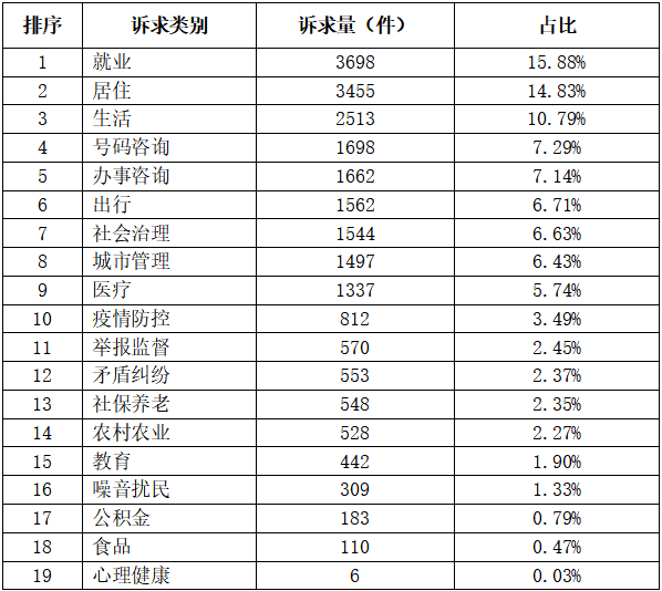按诉求一级类别统计,主要反映的问题依次是:就业、居住、生活、号码咨询、办事咨询、出行、社会治理、城市管理、医疗、疫情防控,以上十类占总比84.91%。