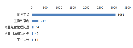 就业类诉求中,市民反映诉求较多的前五类事项分别为:拖欠工资、工资和福利、商业经营管理问题、商业门面租赁问题、工伤认定,以上五类占就业类总比93.32%。