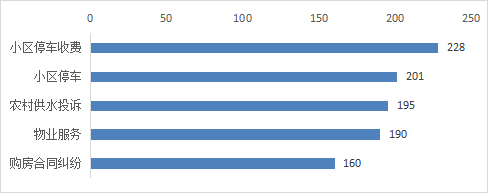 居住类诉求中,市民反映诉求较多的前五类事项分别为:小区停车收费、小区停车、农村供水投诉、物业服务、购房合同纠纷,以上五类占居住类总比28.19%。