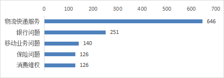 生活类诉求中,市民反映诉求较多的前五类事项分别为:物流快递服务、银行问题、移动业务问题、保险问题、消费维权,以上五类占生活类总比51.29%。